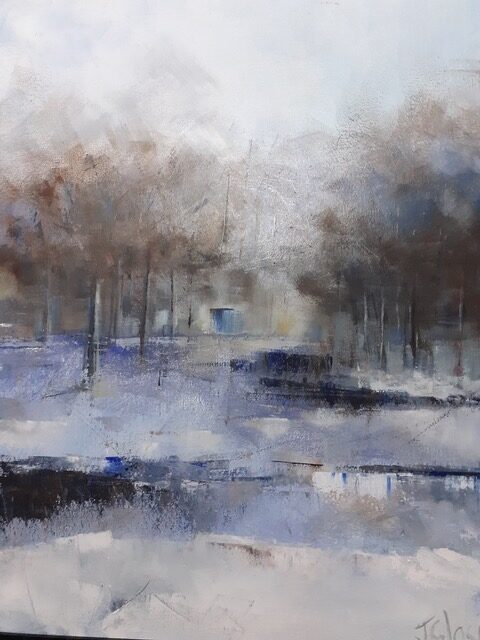 A snowy winter scene of Thompson Park painted by Joanne Glasgow